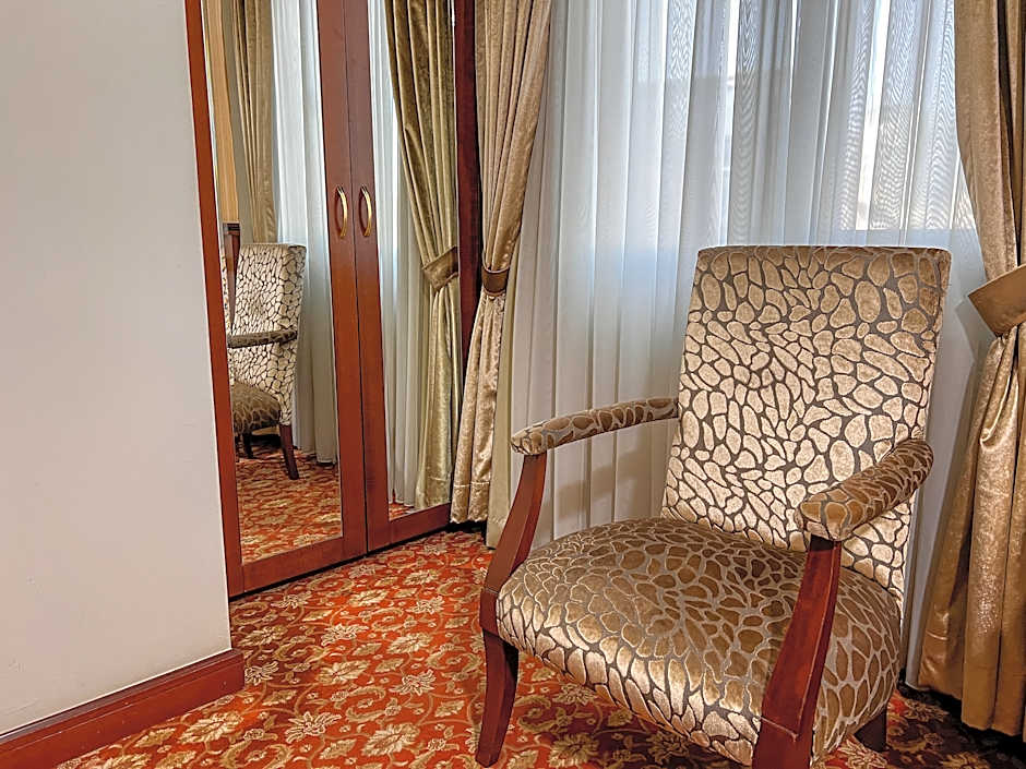 Spacious suite features a private balcony, large seating area and a work desk. It comes with a cable TV and a mini-bar. An private bathroom has a bathtub.